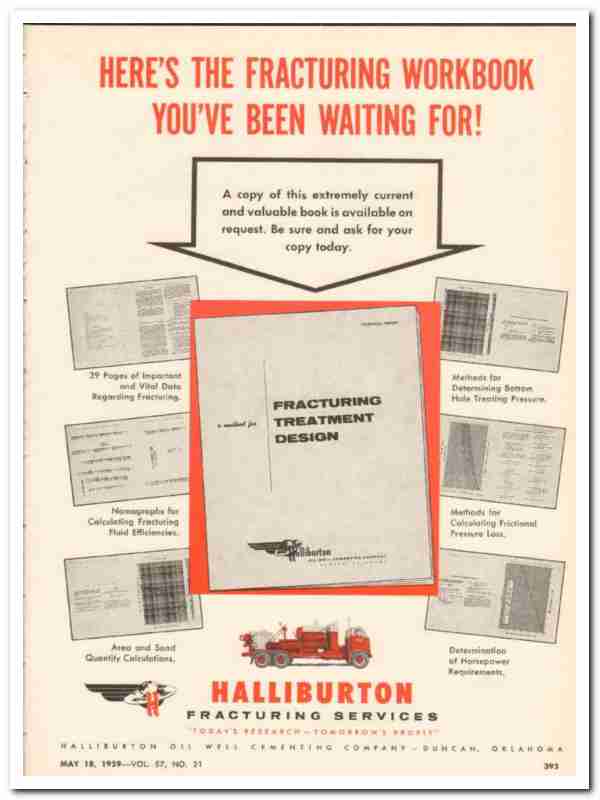 Original oil and gas trade magazine vintage ad for HALLIBURTON OIL WELL CEMENTING COMPANY. Main offices were located in Duncan, OK. Fracturing treatment design. Today's research, tomorrow's profit. This unique 1959 old oilfield petroleum industry magazine advertisement would display beautifully matted and framed.
