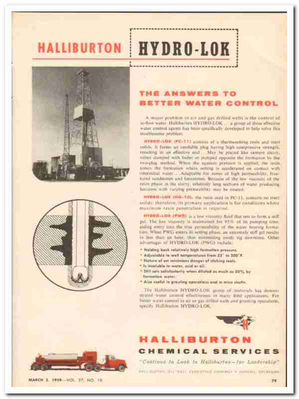 Halliburton Oil Well Cementing Company 1959 Vintage Ad Hydro-Lok Water