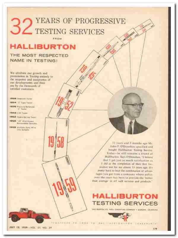 Original oil and gas trade magazine vintage ad for HALLIBURTON OIL WELL CEMENTING.COMPANY. Main offices were located in Duncan, OK. Pictured is Mr John F. O'Donohoe, who specified and bought Halliburton Testing Service. 32 years of progressive services, the most respected name in testing. This unique 1959 old oilfield petroleum drilling industry magazine advertisement would display beautifully matted and framed. Nice graphics.