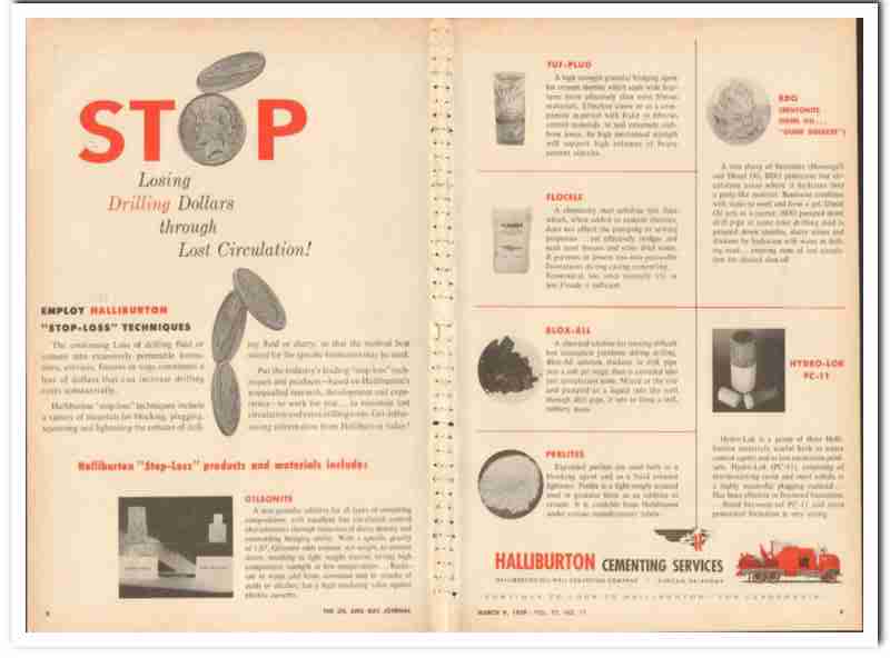 Original oil and gas trade magazine vintage ad for HALLIBURTON OIL WELL CEMENTING COMPANY. Main offices were located in Duncan, OK. Stop Losing Drilling Dollars through lost circulation. Employ stop-loss techniques including a variety of material for blocking, plugging, squeezing and lightening the column of drilling fluid or slurry, so that the method best suited for the specific formation may be used. Includes gilsonite, tuf-plug, flocele, blox-all, perlites, BDO, hydro-lok PC-11. This unique 1959 old oilfield petroleum industry magazine advertisement would display beautifully matted and framed. Two-page gatefold advertisement.