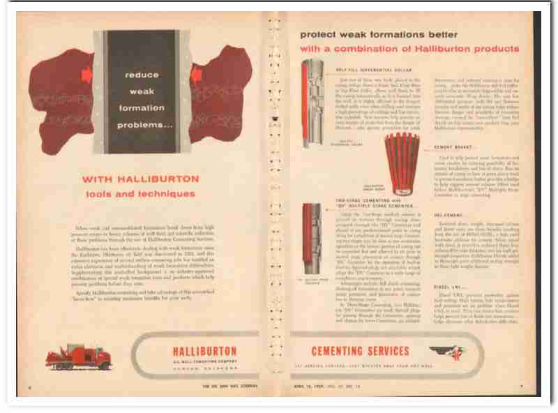 Original oil and gas trade magazine vintage ad for HALLIBURTON OIL WELL CEMENTING COMPANY. Main offices and plant were located in Duncan, OK. Reduce Weak Formation Problems with Halliburton's tools and techniques. Self-fill differential collar, cement basket, gel-cement, diacel lwl, and two state cementing with DV multiple stage cementer. This unique 1959 old oilfield petroleum industry magazine advertisement would display fantastic matted and framed. Nice graphics. Two page gatefold advertisement.