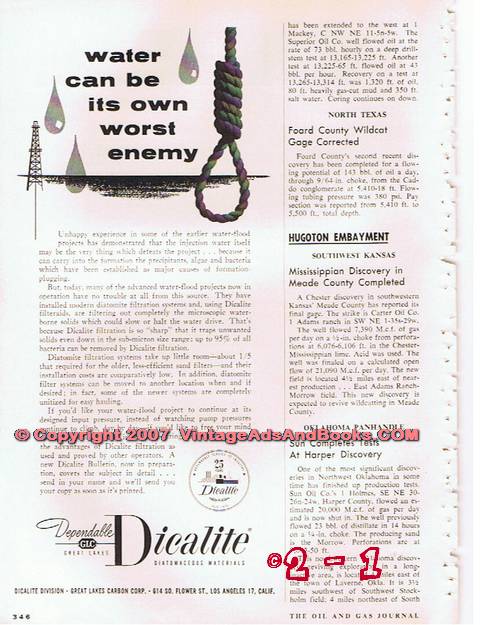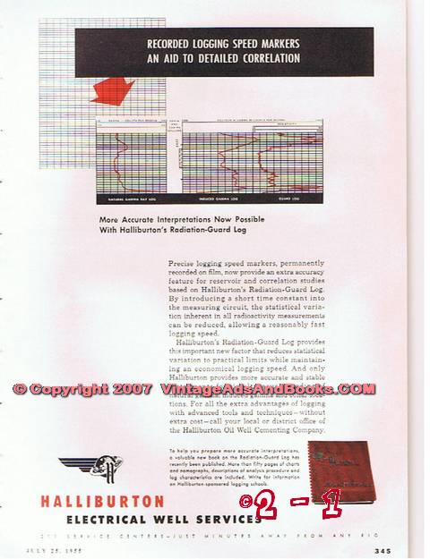 Original oil and gas trade magazine vintage ad for HALLIBURTON OIL WELL CEMENTING COMPANY of Duncan, OK. Recorded Logging Speed Markers An Aid to Detailed Correlation, More Accurate Interpretations Now Possible With Halliburton's Radiation-Guard Log. Halliburton Electrical Well Services. Unique 1955 old oilfield petroleum drilling industry magazine advertisement. On the reverse side is a fractional page ad for GREAT LAKES CARBON CORP., DICALITE DIVISION of Los Angeles, CA. Water Can Be Its Own Worst Enemy. Dicalite filtrations. Old 1955 petroleum industry magazine advertisement. Approximate page size 9 x 12 inches.