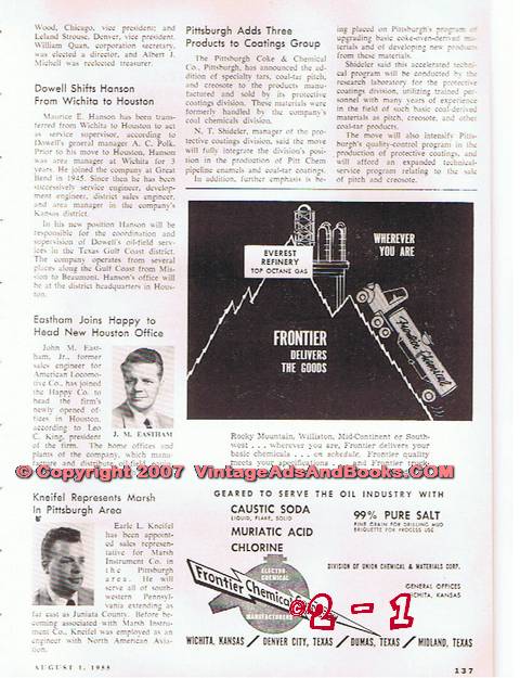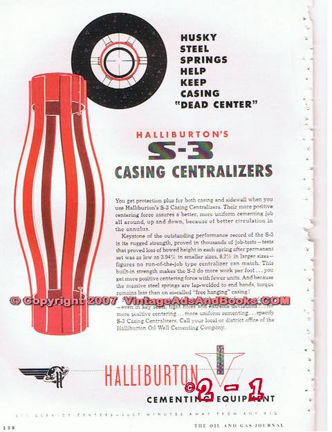 Original oil and gas trade magazine vintage ad for HALLIBURTON OIL WELL CEMENTING COMPANY. Main office was located in Duncan, OK.   S-3 Casing Centralizers. Husky Steel Springs Help Keep Casing Dead Center. Halliburton Cementing Equipment. Unique 1955 old oilfield petroleum industry equipment magazine advertisement.  Nice graphics. On the reverse side is a fractional page ad for FRONTIER CHEMICAL COMPANY of Wichita, KS.  Division of Union Chemical and Materials Corporation. Wherever You Are Frontier Delivers The Goods. Old 1955 petroleum industry magazine advertisement. Approximate page size  9 x 12 inches.