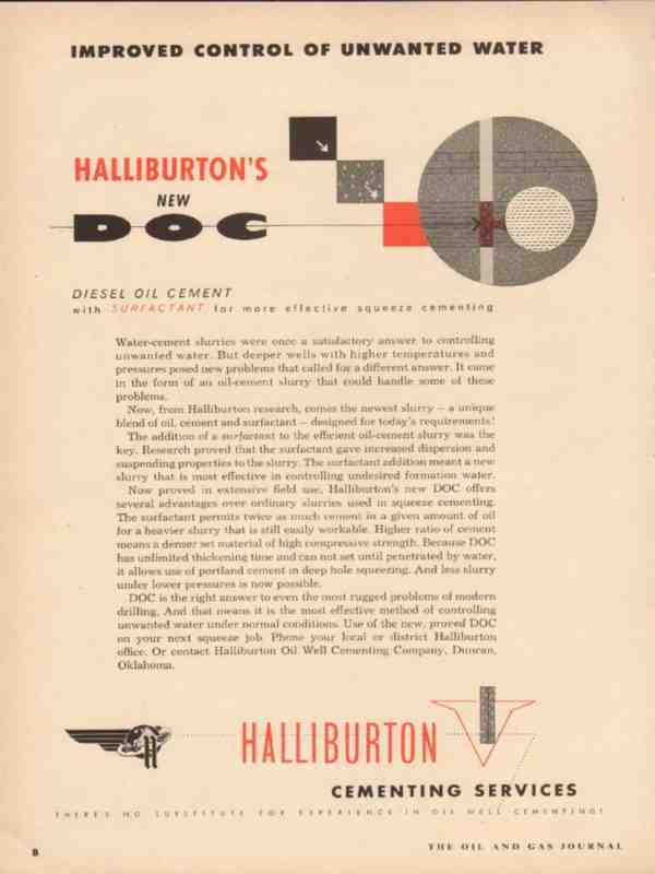 Original oil and gas trade magazine vintage ad for HALLIBURTON OIL WELL CEMENTING COMPANY of Duncan, OK. Improved Control of Unwanted Water with Halliburton's New DOC Diesel Oil Cement with Surfactant for More Effective Squeeze Cementing. Halliburton Cementing Services. Unique 1954 old oilfield petroleum industry magazine advertisement.