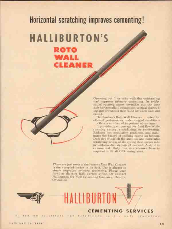 Original oil and gas trade magazine vintage ad for HALLIBURTON OIL WELL CEMENTING COMPANY of Duncan, OK.  Horizontal Scratching Improves Cementing!  Roto Wall Cleaner. Halliburton Cementing Services. Unique 1954 old oilfield petroleum industry magazine advertisement.