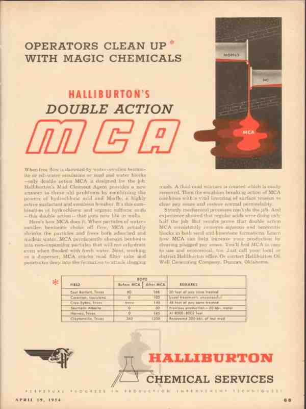Original oil and gas trade magazine vintage ad for HALLIBURTON OIL WELL CEMENTING COMPANY of Duncan, OK. Halliburton's Double Action MCA. Operators Clean Up with Magic Chemicals. Halliburton Chemical Services. Unique 1954 old oilfield petroleum industry magazine advertisement.