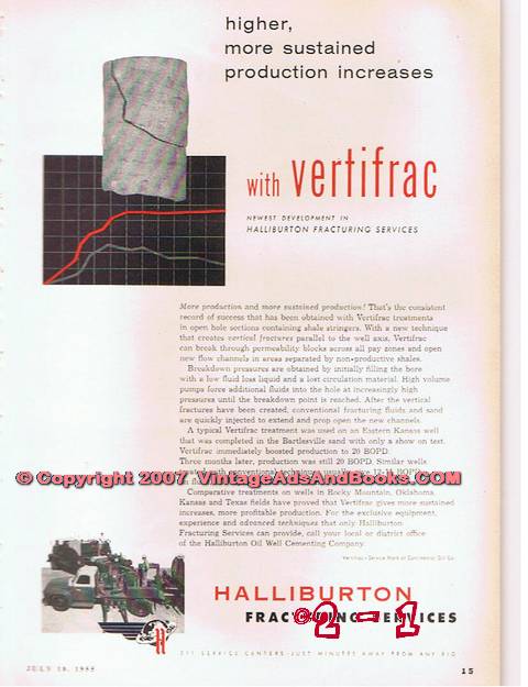 Original oil and gas trade magazine vintage ad for HALLIBURTON OIL WELL CEMENTING COMPANY of Duncan, OK. Higher, more sustained production increases with Vertifrac, newest development in Halliburton Fracturing Services. Unique 1955 old oilfield petroleum industry magazine advertisement. Approximate size 9 x 12 inches.