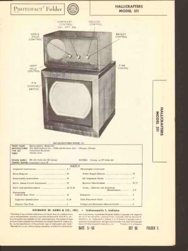 Vintage HALLICRAFTERS model 511 24 tube TV television receiver. Original old Sams Photofact manual includes schematic, layout, alignment info, voltage & resistance test charts, repair parts list. 20 pages. Dated 1950. Hallicrafters Company of Chicago, IL. This manual would make a sensational accompaniment to your vintage video TV equipment.