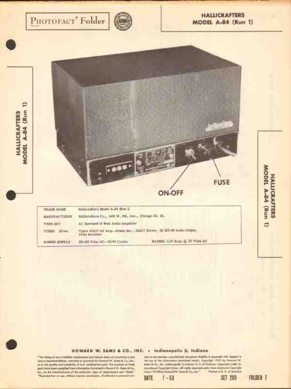 Vintage HALLICRAFTERS model A-84 (Run 1) 10 watt audio amplifier. Original old Sams Photofact manual includes schematic, layout, alignment instructions, voltage & resistance test chart, repair parts list. 4 pages. Dated 1953. This manual would make a sensational accompaniment to your classic audio equipment.