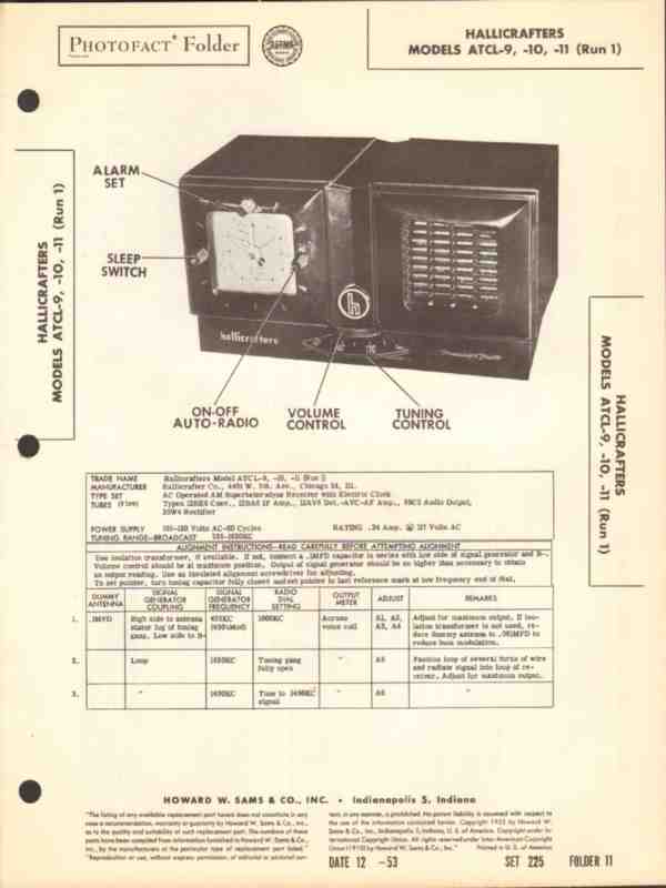 Vintage HALLICRAFTERS models ATCL-9, ATCL-10 and ATCL-11 5 tube Superheterodyne AM radio receiver with electric clock. Original old Sams Photofact manual includes schematic, layout, alignment instructions, voltage & resistance test chart, repair parts list. 4 pages. Dated 1953. Hallicrafters Company of Chicago, IL. This manual would make a sensational accompaniment to your classic radio equipment.