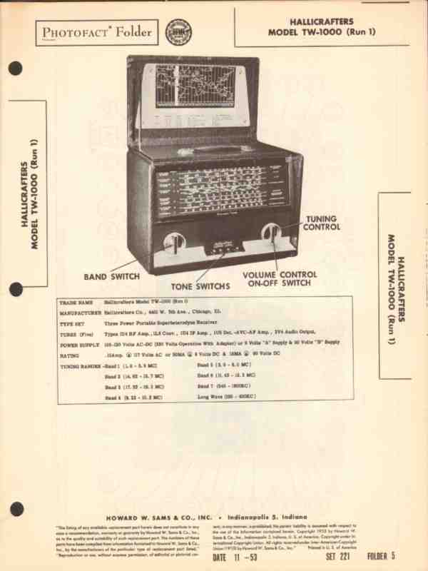 Vintage HALLICRAFTERS model TW-1000 (Run 1) 5 tube Superheterodyne 8 band AM SW radio receiver. Original old Sams Photofact manual includes schematic, layout, alignment instructions, voltage & resistance test chart, repair parts list. 8 pages. Dated 1953.