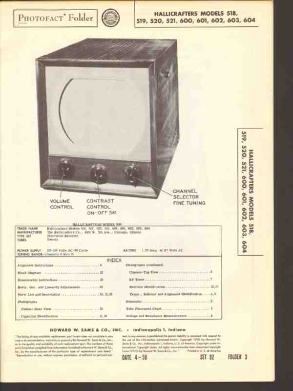 hallicrafters models 518 19 20 21 600 1 2 3 4 tv sams photofact manual