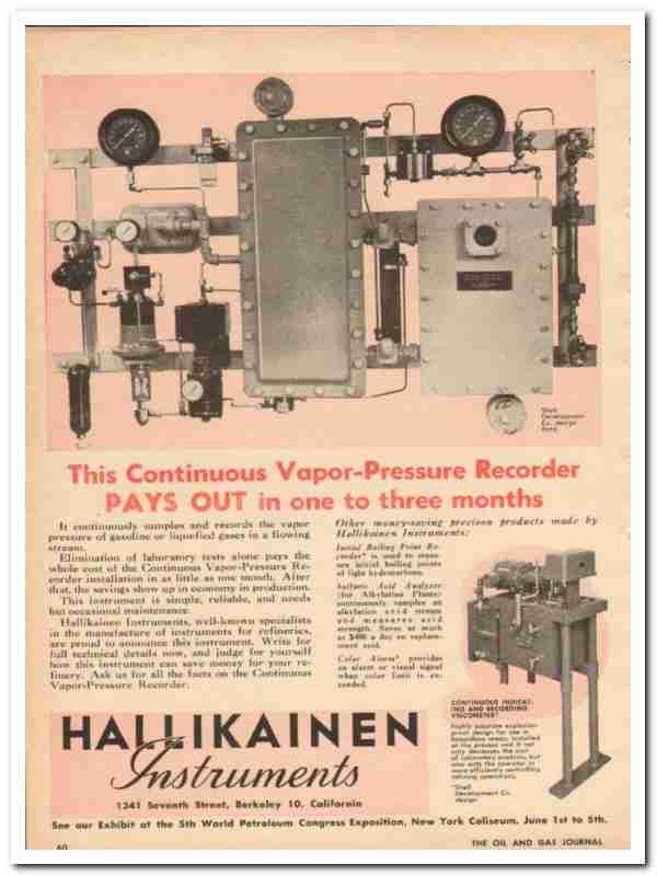 Original oil and gas trade magazine vintage ad for HALLIKAINEN INSTRUMENTS, INC. Main office was located at 1341 Seventh Street, Berkeley, CA. Continuous Vapor-Pressure Recorder pays out in one to three months. Continuously samples and records the vapor pressure of gasoline or liquefied gases in a flowing stream. This unique 1959 old petroleum products refining industry magazine advertisement would display beautifully matted and framed. Nice graphics.