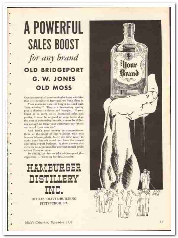 Hamburger Distillery Inc 1935 vintage whiskey ad success Jones Moss