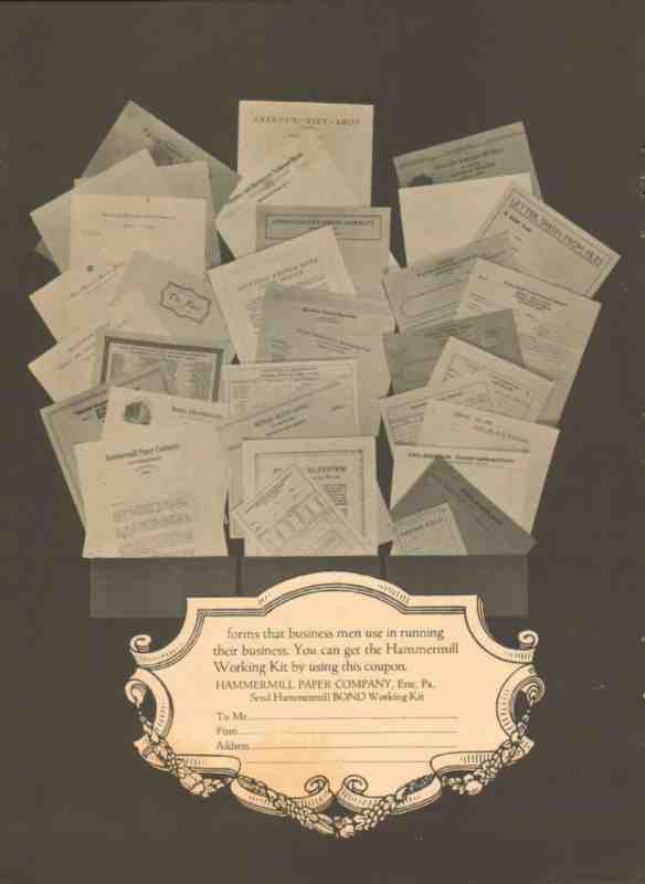 Original printing vintage ad for HAMMERMILL PAPER COMPANY in Erie, PA. Tools of Management. Every mill and factory came into existence and continues to make a living for a number of people, because a group of men directing that business, buy, checking paper forms that businesses use. This 1926 unique old two sided commercial print industry trade magazine advertisement would display beautifully matted and framed.