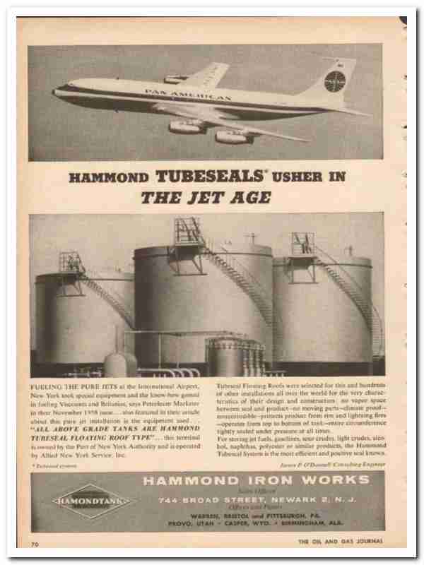 Original oil and gas trade magazine vintage ad for HAMMOND IRON WORKS.  Main office was located at 744 Broad Street, Newark, NJ. Jet Age with Tubeseals Floating Roof Tanks.  Used at International Airport, New York fueling jets for Viscount and Britania. Terminal owned by the Port of New York Authority. This unique 1959 old petroleum products storage industry magazine advertisement would display fantastic matted and framed. Nice graphics.