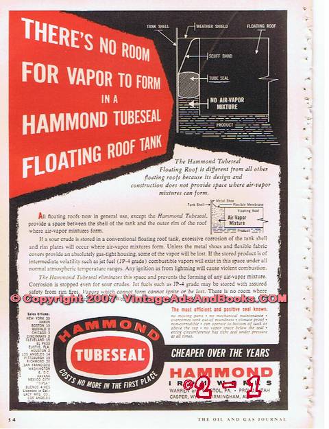 Original oil and gas trade magazine vintage ad for HAMMOND IRON WORKS, of Warren, PA, Bristol, PA. Provo, UT, Casper, WY, and Birmingham, AL. There's No Room For Vapor To Form In A Hammond Tubeseal Floating Roof Tank. This unique 1955 old petroleum products storage industry magazine advertisement would look sensational matted and framed. Nice graphics. Approximate size 9 x 12 inches.
