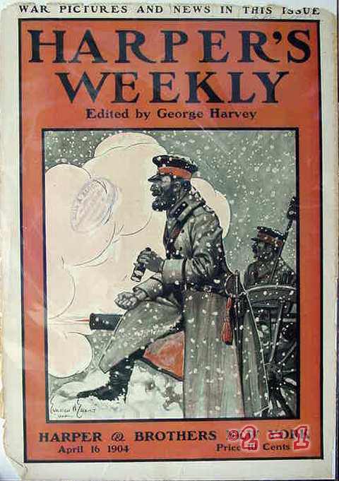 Original vintage magazine print cover, HARPER'S WEEKLY. Art by Gordon Grant. Winter War scene with snow falling. It is chipped at the edges and is stamped, as seen in the picture, but would matte and frame nicely. Old Harper's Weekly April 16, 1904 cover.