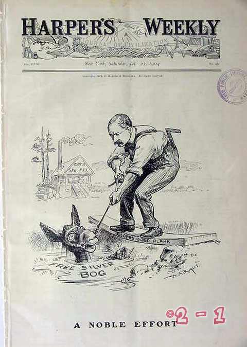 Original vintage magazine print cover, HARPER'S WEEKLY. A Noble Effort, Esopus Saw Mill, Esopus Gold Plank and Free Silver Bog. Art by W. A. Rogers. Stamp on center. Old July 23, 1904 cover. Would look fantastic matted and framed.