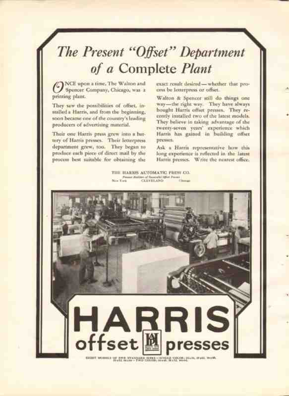 Original old printing magazine vintage ad for HARRIS AUTOMATIC PRESS COMPANY in Cleveland, OH. The Walton and Spencer Co., Chicago, was a printing plant. They saw the possibilities of offset, installed a Harris, and from the beginning, soon became one of the country's leading producers of advertising material. This 1926 unique one page printer industry trade advertisement would display beautifully matted and framed.