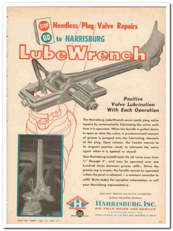 Harrisburg Inc 1959 Vintage Ad Oil Field LubeWrench Plug Valve Repairs