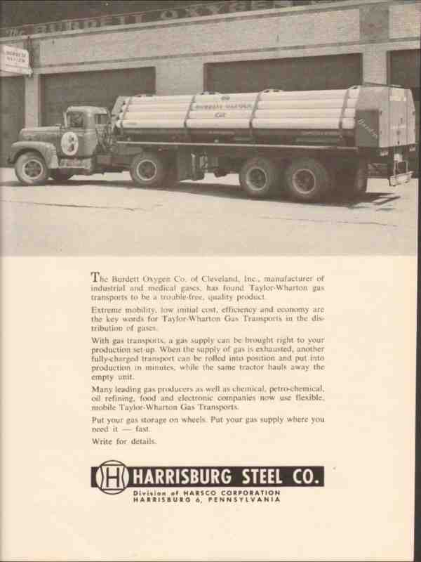 Original oil and gas trade magazine vintage ad for HARRISBURG STEEL COMPANY of Harrisburg, PA. Division of Harsco Corporation. The Burdett Oxygen Company, of Cleveland, OH, manufacturer of industrial and medical gases, has found Taylor-Wharton Gas Transports to be a trouble free, quality product. This unique 1962 old steel industry gas magazine advertisement would display beautifully matted and framed.