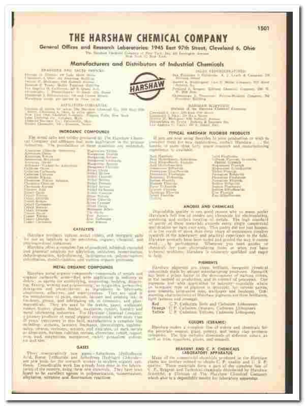 Original 1947 industrial chemical trade vintage catalog for the HARSHAW CHEMICAL COMPANY. Main office and Research Laboratories were located at 1945 East 97th Street, Cleveland, OH.