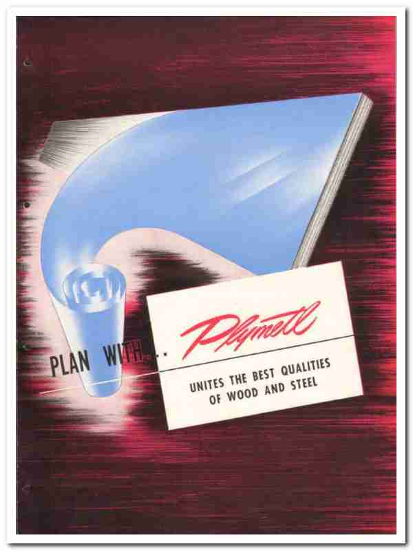 Manufacturers of Plymetl. The Best Qualities of Wood and Steel. Products include railway car bulkheads, partitions, frieze panels, pier panels, interior doors, luggage shelves, table tops and cabinets. Has numerous product images with detailed descriptions, uses, applications, specifications and dimensions provided. Unbound from a large 1946 postwar industrial product designer catalog, this unique old eight page technical brochure would display beautifully matted and framed. Awesome cover graphics. A fantastic addition to your vintage industrial equipment library. (SC 46)