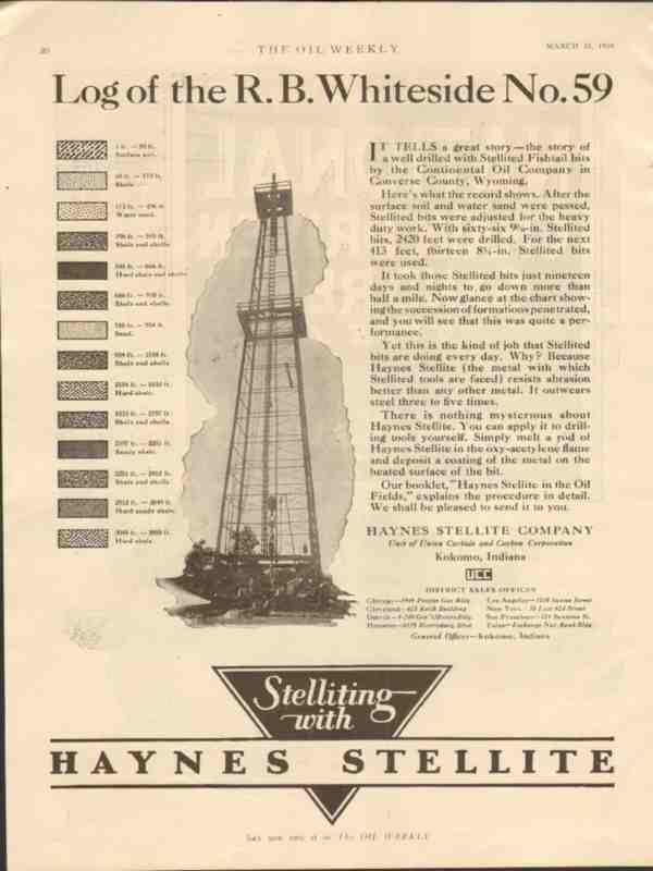 Original oil and gas trade magazine vintage ad for HAYNES STELLITE COMPANY of Kokomo, IN. Log of the R.B. Whiteside No. 59 tells the story of an oil well drilled with Stellited Fishtail Bits by the Continental Oil Company, of Converse County, WY. Unique 1928 old oilfield petroleum drilling industry magazine advertisement would display nicely matted and framed. Slight crease down center of page.