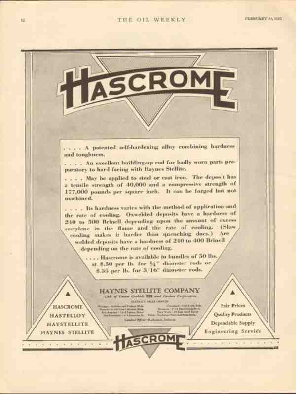 Original oil and gas oilfield drilling industry trade magazine vintage ad for HAYNES STELLITE COMPANY of Kokomo, IN. Hascrome, a Patented Self Hardening Alloy Combining Hardness and Toughness, Applied to Steel or Cast Iron. Old 1930 petroleum equipment magazine advertisement.