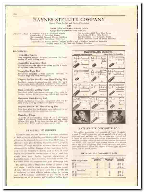 Products include Haystellite Inserts, Composite Rods, Tube Rods, Hard-Facing Rods, Hascrome Hard-Facing Rods, '93' Hard-Facing Rods, Cutting Tools and Hastelloy Alloys, all are fully featured.