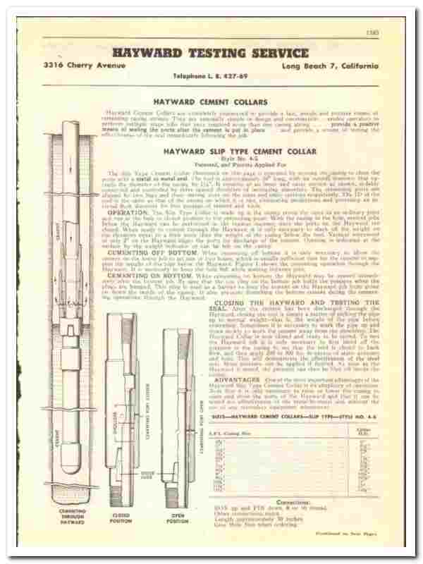 Products include the Hayward Slip Type Cement Collar, Hayward Screw Type Cement Collar and Hayward Testing Equipment, al are fully featured.