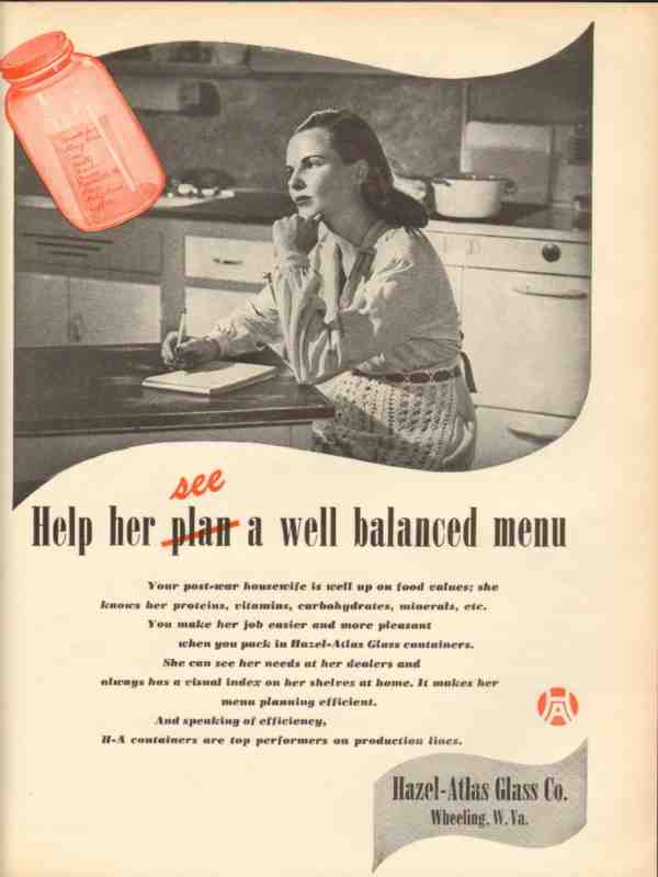Original vintage food packing industry trade magazine ad for HAZEL ATLAS GLASS COMPANY of Wheeling, WV. Help Her See a Well Balanced Menu. Your post-war housewife is well up on food values. You make her job easier and more pleasant when you pack in Hazel-Atlas Glass Containers. Old 1946 canning and processing advertisement.