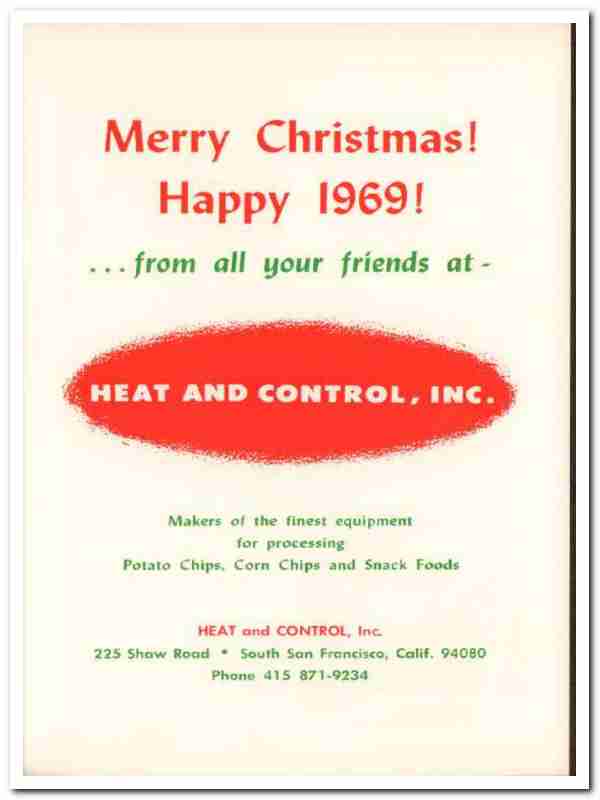Original 1968 potato chip trade magazine vintage ad for HEAT and CONTROL, INC. Main office and factory was located at 225 Shaw Road, South San Francisco, CA. Merry Christmas! Happy 1969! From all your friends at Heat and Control, Inc. Makers of the finest equipment for processing potato chips, corn chips and snack foods. This old one page snack food manufacturing equipment advertisement would display beautifully matted and framed.