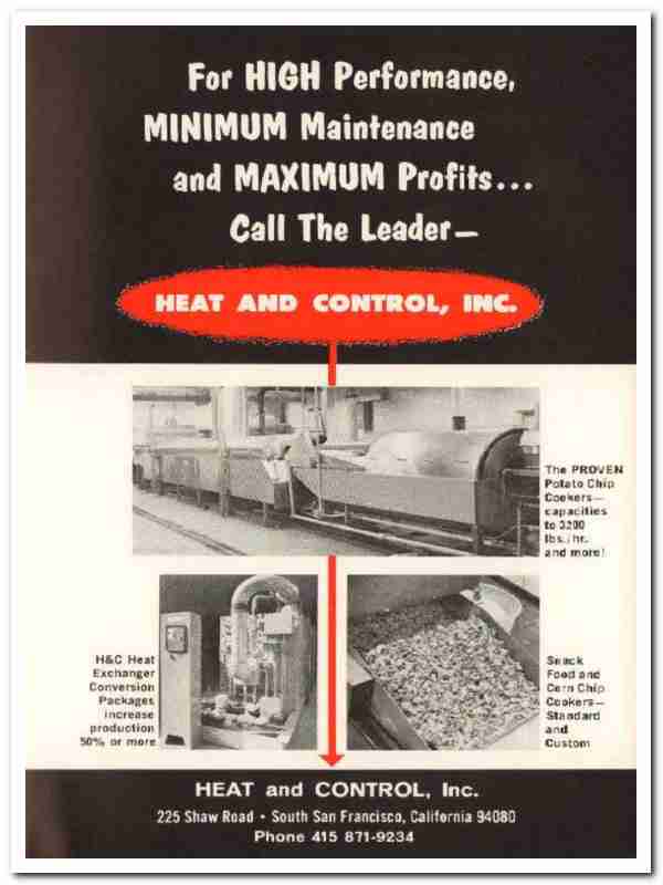 Original 1968 potato chip trade magazine vintage ad for HEAT and CONTROL, INC. Main office and factory was located 225 Shaw Road, South San Francisco, CA. For high performance, minimum maintenance and maximum profits, Call the leader, Heat and Control, Inc. Potato chip cookers. Heat Exchangers Conversion Packages increase production 50%. Snack food and corn chip cookers. This old one page snack food manufacturing advertisement would display beautifully matted and framed.