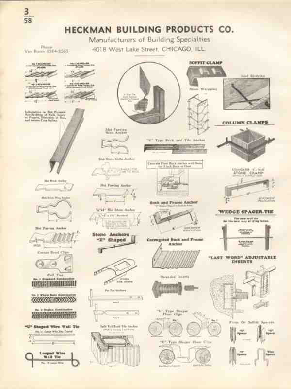 Original wall trade vintage catalog for HECKMAN BUILDING PRODUCTS COMPANY. Main office and factory was located at 4018 West Lake Street, Chicago, IL. Manufacturers of Building Specialties. Products include anchors, clips, ties, spacer-tie and cramp. Numerous product images and illustrations. Unbound from a large 1938 architectural catalog, this unique old one page technical brochure would display wonderful matted and framed. Very nice graphics. A terrific addition to your retro wall construction library.