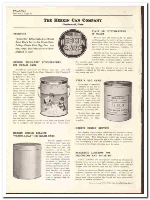 Products include Heekin 'Home-Use' Lithographed Ice Cream Cans, Heekin Single Service 'Throw-Away' Ice Cream Cans and Heekin Egg Cans, all are fully featured.