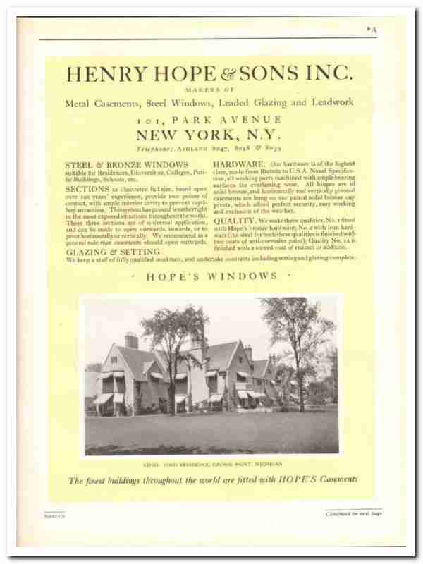 Original window trade vintage catalog for HENRY HOPE & SONS, INC. Main office was located at 101 Park Avenue, New York City, NY. Manufacturers of metal casement, steel and bronze windows. Leading glazing and leadwork makers. Shown is the Edsel Ford residence, Grosse Point, MI. Photograph of side hung top hung casement with full size details at jambs of sections no. 21, 22 and 23. Unbound from a large 1931 architectural catalog, this unique old two-sided technical brochure would display wonderful matted and framed. Nice graphics. A fabulous addition to your retro steel window library. Contains small amount of residual glue on edge.