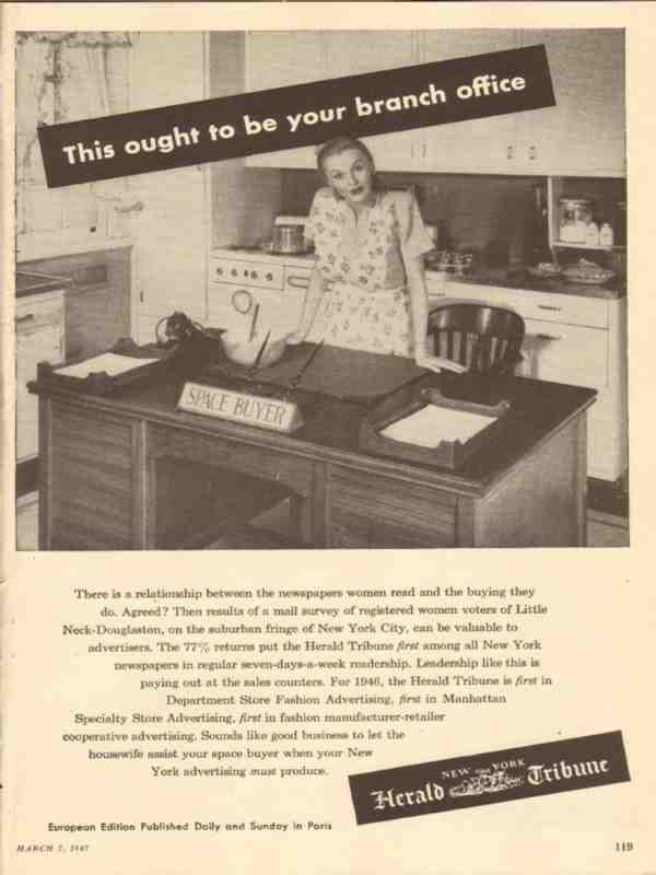 Original vintage advertising media trade magazine ad for HERALD TRIBUNE Newspaper of New York City, NY. This Ought to be Your Branch Office. The results of a mail survey of registered women voters of Little Neck-Douglaston, on the fringe of New York City, can be valuable to advertisers. The Herald Tribune is first among all New York newspapers. Old 1947 magazine advertising industry advertisement, would display beautifully matted and framed.
