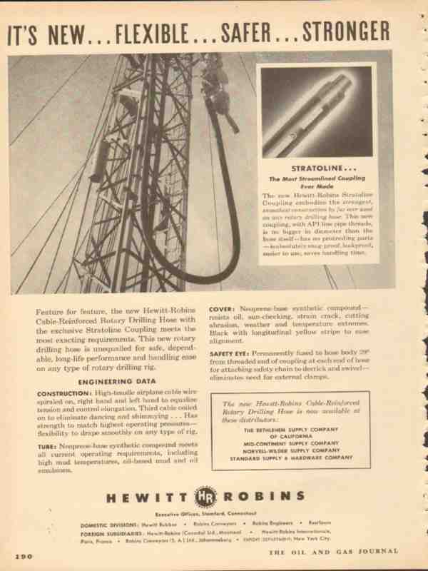 Original oil and gas trade magazine vintage ad for HEWITT ROBINS, INC of Stamford, CT. It's New, Flexible, Safer, Stronger. Stratoline, the Most Streamlined Coupling Ever Made. Cable Reinforced Rotary Drilling Hose with Stratoline Coupling Meets the Most Exacting Requirements. Unique 1953 old oilfield petroleum drilling industry equipment magazine advertisement.