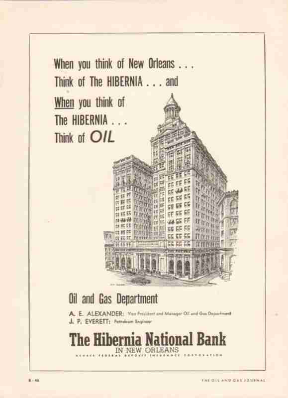 Original vintage oil and gas magazine ad, HIBERNIA NATIONAL BANK, Oil and Gas Department, A.E. Alexander - Vice President and Manager Oil and Gas Department, J.P. Everett - Petroleum Engineer. The Hibernia National Bank in New Orleans, LA. Art by Hobbs. . Old 1959 banking advertisement for the petroleum industry. Would display nicely matted and framed.