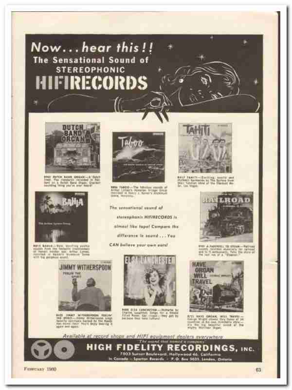 Original stereo vintage ad for HIGH FIDELITY RECORDINGS, INC. Main office was located at 7803 Sunset Boulevard, Hollywood, CA. Stereophonic HiFi Records, hear the sensational sound, almost like tape. Pictured are Dutch Band Organ, Taboo, Tahiti, A Farewell to Steam, Bahia, Jimmy Witherspoon Feelin the Spirit, Elsa Lanchester, Have Organ Will travel. Available at record shops and hi-fi equipment dealers everywhere. This unique old one page 1960 stereo trade magazine advertisement would display beautifully matted and framed. It would make a nice accompaniment to your vintage stereo.