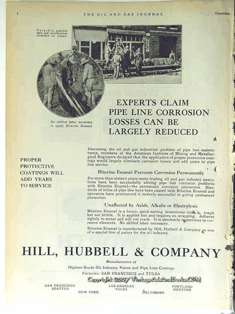 Original oil and gas trade magazine vintage ad for HILL, HUBBELL & COMPANY of San Francisco, CA and Tulsa, OK. Experts Claim Pipe Line Corrosion Losses Can be Largely Reduced with Biturine Enamel. Manufacturers of Highest Grade Oil Industry Paints and Pipe Line Coatings. Old 1928 petroleum pipeline equipment industry advertisement. Nice graphics.
