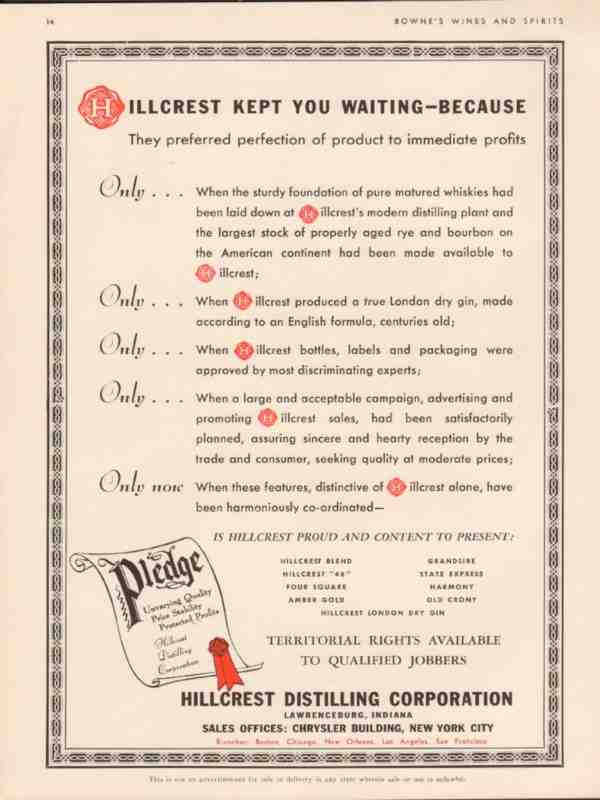 Original vintage whiskey, wine and spirits trade magazine ad for HILLCREST DISTILLING CORPORATION. Main office and plant was located in Lawrenceburg, IN. Hillcrest Kept You Waiting Because They Preferred Perfection of Product to Immediate Profits. Old 1934 rare Post Prohibition era whiskey advertisement.