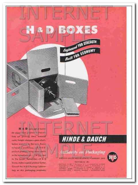 Original vintage industrial magazine ad, for HINDE AND DAUCH of Sandusky, OH. H and D Boxes, Engineered for Strength, Built for Economy. Corrugated boxes do more than protect in transit. Old 1948 industry advertisement. Would look sensational matted and framed.