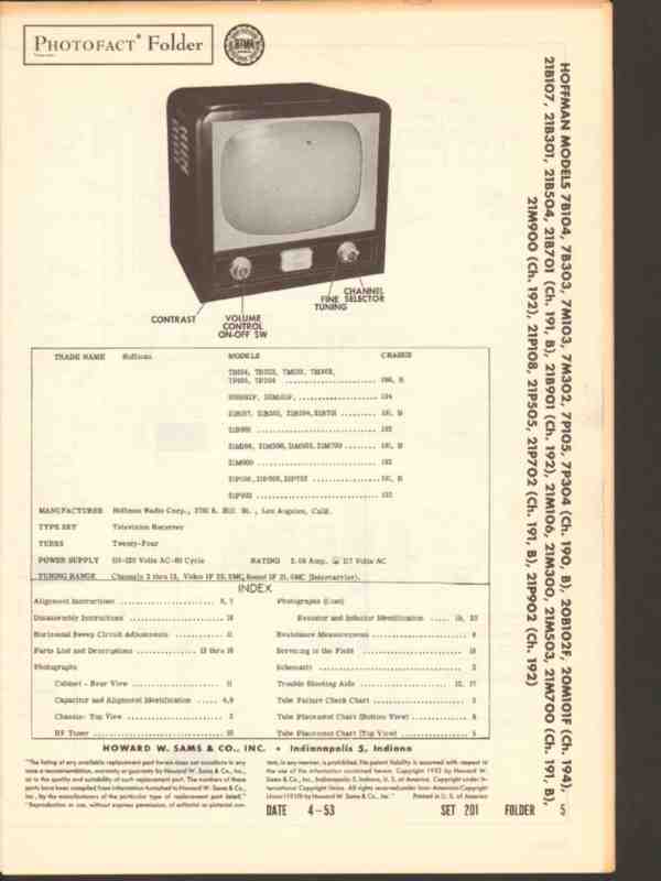 Vintage HOFFMAN models 7B104, 7B303, 7M103, 7M302, 7P105,. 7P304 (chassis 190 190B), models 20B102F, 20M101F (chassis 194), models 21B107, 21B301, 21B504, 21B701 (chassis 191 191B), model 21B901 (chassis 192), model 21M106, 21M300, 21M503, 21M700 (chassis 191 191B) model 21M900 (chassis 192), model 194 TV television receiver. Original old Sams Photofact manual includes schematic, layout, alignment instructions, voltage & resistance test chart, repair parts list. 20 pages. Dated 1953. Hoffman Radio Corp., of Los Angeles, CA. This manual would make a sensational accompaniment to your classic video TV equipment.