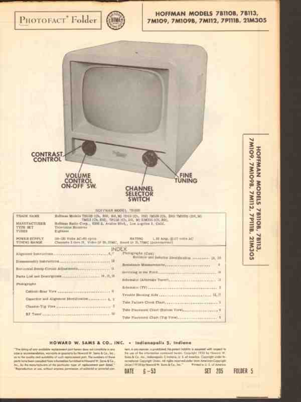 Vintage HOFFMAN models 7B110B, 7B113, 7M109, 7M109B, 7M112, 7P11B and 21M305 18 tube TV television receiver. Original old Sams Photofact manual includes schematic, layout, alignment instructions, voltage & resistance test chart, repair parts list. 20 pages. Dated 1953. Hoffman Radio Corp., of Los Angeles, CA. This manual would make a sensational accompaniment to your classic video TV equipment.