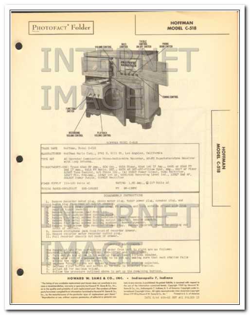 Vintage HOFFMAN model C-518 Superheterodyne AM FM radio receiver with phonograph record player and wire recorder. Original old Sams Photofact manual includes schematic, layouts, alignment info, adjustments, voltage & resistance charts, repair parts list. 12 pages. Dated 1949. Hoffman Radio Corp., of Los Angeles, CA. This manual would make a sensational accompaniment to your vintage audio equipment.