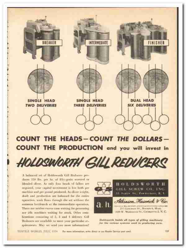 Original 1954 textile trade vintage ad for HOLDSWORTH GILL SCREW COMPANY, INC. Main office and plant was located at 55 Sabin Street, Pawtucket, RI. Atkinson, Haserick & Company, 211 Congress Street, Boston, MA (Textile Machinery Agents & Engineers, Since 1823).