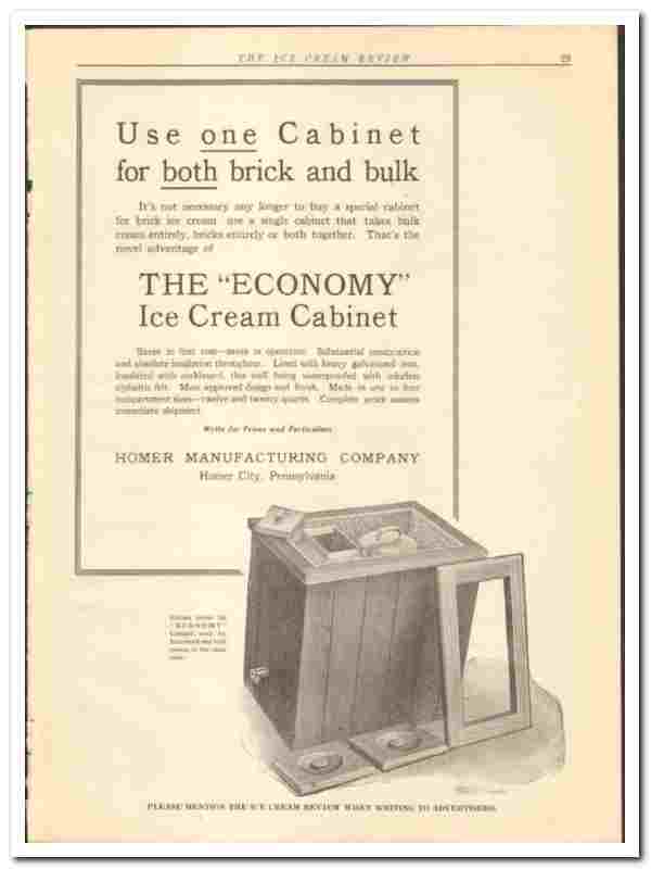 Homer Mfg Company 1919 vintage ice cream ad Economy Cabinet brick